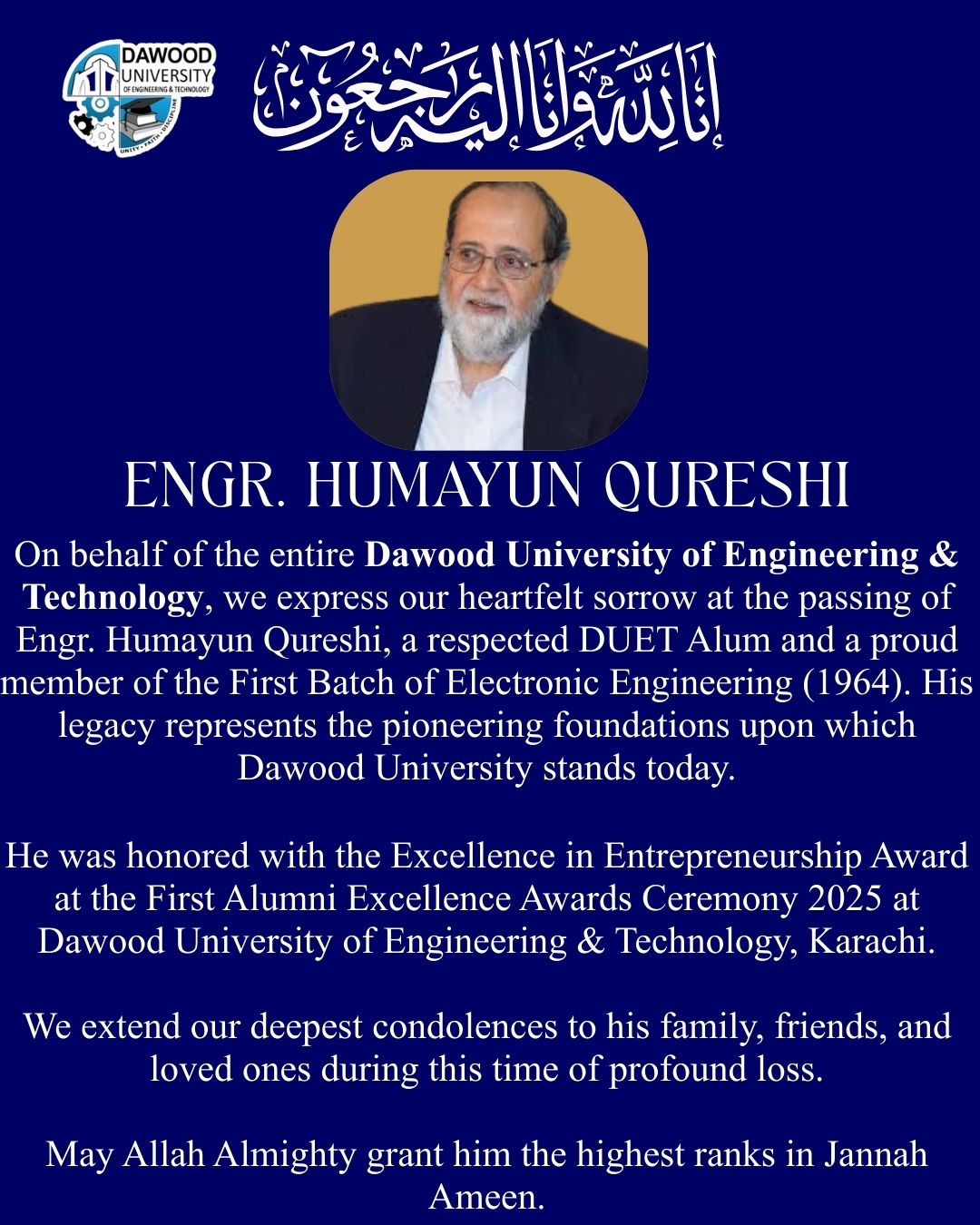 I bow my head before Allah the Almighty for all His blessings and delighted to share the progress Dawood University of Engineering and Technology has made over the past year. Our vision for graduate success is built on a three-pronged approach: